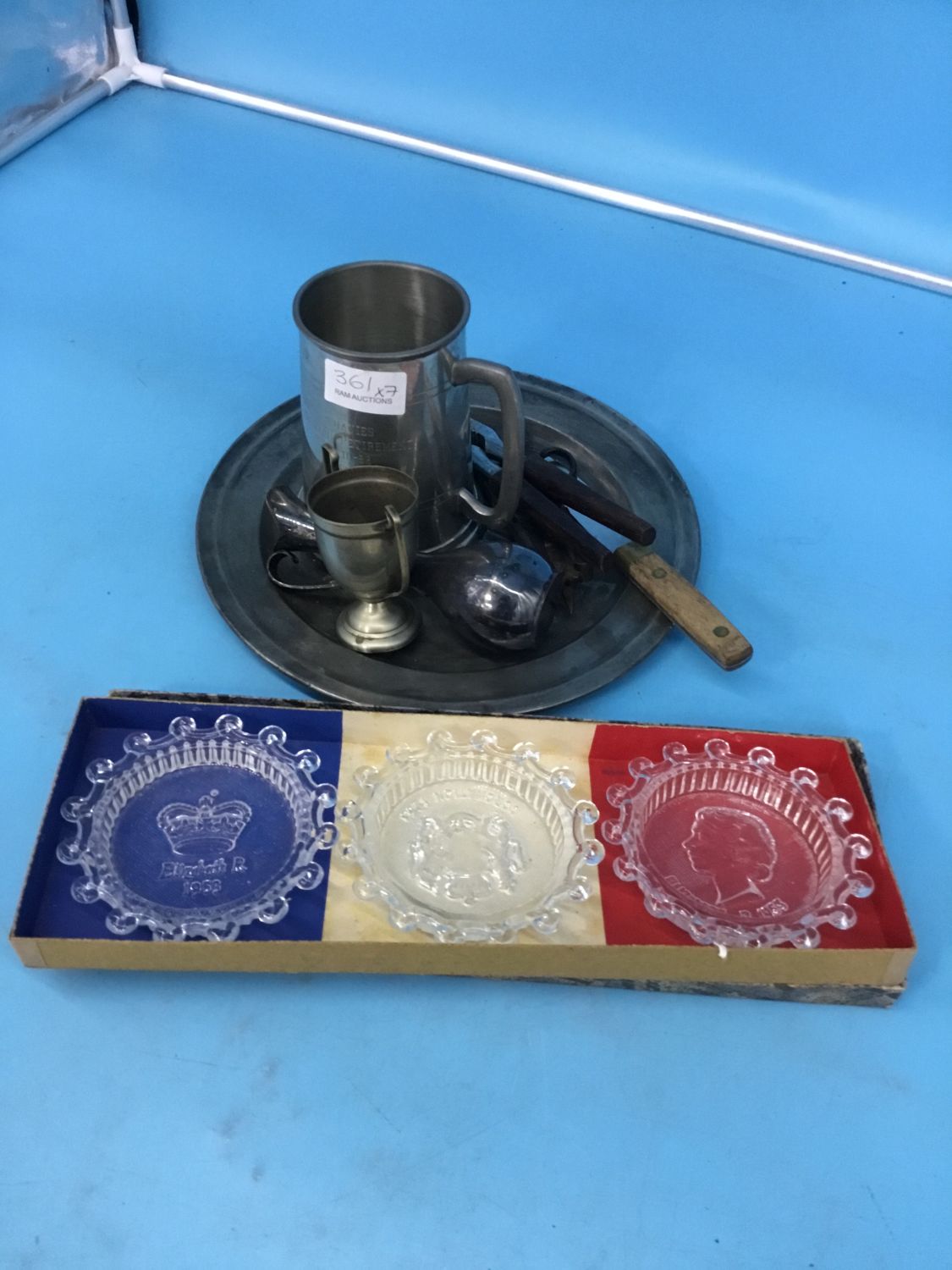 Selection of boxed coronation dishes plus EPNS + pewter ware