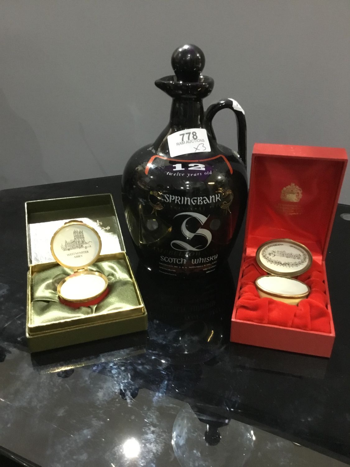 Campbell Town Whiskey Decanter and 2 Pill Boxes